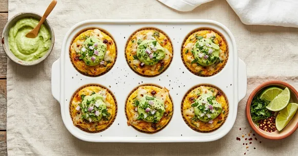 Meal-prep storage for the work week. Let egg cups cool completely, then store in a single layer in an airtight container in the fridge for up to 5 days. Keep the avocado crema in a separate small container with plastic wrap pressed directly onto the surface to prevent browning — it holds well for 3 days. To extend crema freshness, add an extra squeeze of lime juice. Reheat egg cups in the microwave for 30–45 seconds or enjoy them cold.