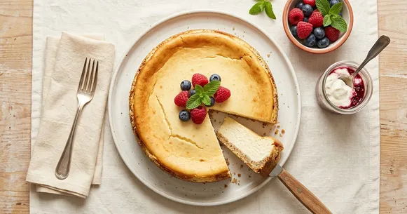 - Bake at 150°C for 45–50 minutes. The cheesecake is done when the edges are set but the centre still has a gentle wobble (about a 5cm circle). It will firm up completely as it cools.