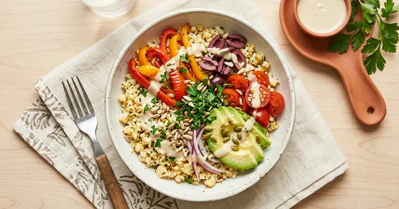 Cauliflower rice is the backbone of this bowl, replacing traditional grains with a fraction of the carbs. The tahini dressing delivers healthy fats and a creamy richness that keeps the dish satisfying, while the olives contribute even more beneficial fats. Despite being vegan, the combination of cauliflower, tahini, and olives provides a well-rounded macro profile. The 5g of fiber from the vegetables and cauliflower helps with satiety and digestive health, and the Mediterranean flavour profile means you won't feel like you're eating "diet food."