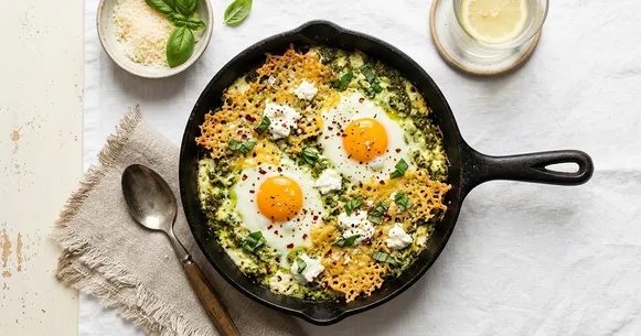 Imagine cracking eggs into sizzling pesto butter, dolloping clouds of whole-milk ricotta between the yolks, and showering everything with parmesan that crisps into golden, lacy edges right in the skillet. This one-pan Italian breakfast is the kind of morning meal that feels indulgent and restaurant-worthy yet comes together in barely fifteen minutes. Every bite delivers creamy, herby, savory richness — the ricotta melts into soft, pillowy pockets while the pesto butter infuses the egg whites with fragrant basil and garlic.