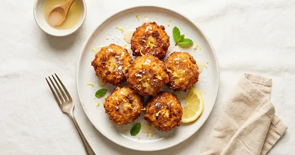 Glaze and serve. Arrange the warm fritters on a serving plate. Drizzle the lemon glaze over the top using a spoon or a small piping bag for a more elegant presentation. Serve immediately while the fritters are still warm and the glaze is glossy.