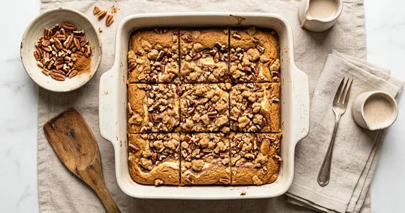 Add the pecan crumble. In the same small bowl, toss the chopped pecans with the cold butter cubes and erythritol-monk fruit blend, pinching and pressing with your fingers until rough, crumbly clusters form. Scatter the pecan crumble evenly over the swirled batter. Press very gently so the pecans nestle into the surface without sinking.