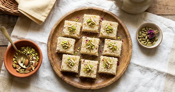 - Fine desiccated coconut gives the smoothest texture. Coarse or flaked coconut will make the barfi more rustic and harder to press into a firm slab.