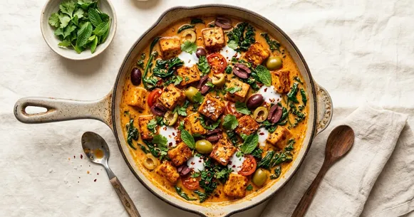 Picture this: golden-seared tofu nestled in a pool of smoky, rust-colored coconut harissa sauce, studded with briny kalamata olives and draped with just-wilted baby spinach. Every bite delivers the rich heat of North African harissa tempered by velvety coconut cream — a combination that sounds unexpected but tastes absolutely right. This is the kind of deeply satisfying weeknight dinner that makes you forget you are eating low-carb, and it all comes together in a single skillet.
