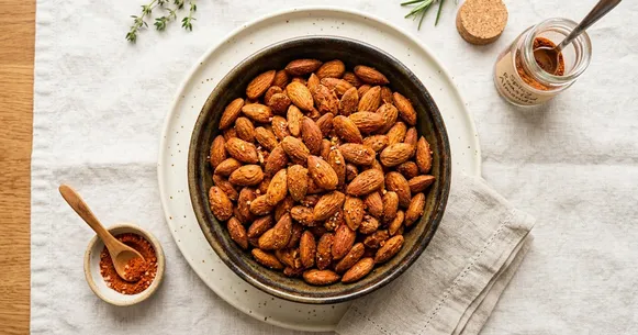 - Sprinkle the spice mixture over the oiled almonds and toss thoroughly, making sure the spices coat the nuts as evenly as possible.